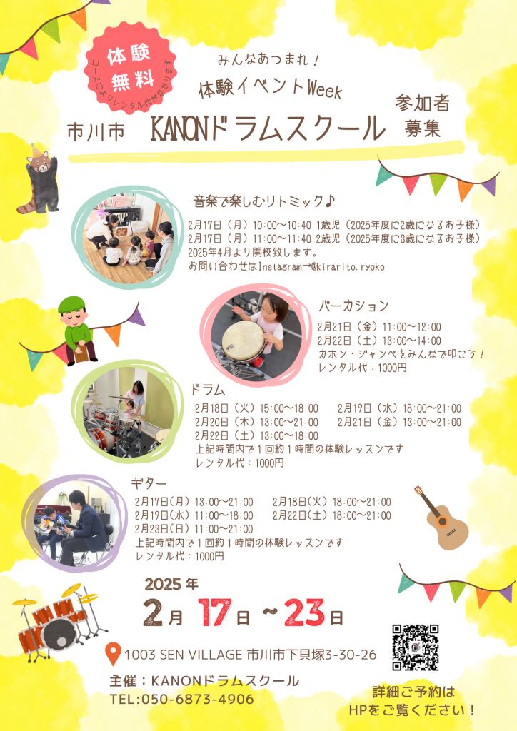 市川市 KANONドラムスクール 参加者募集のお知らせです。